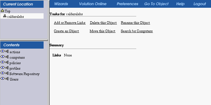Caldera Volution Manager provides a number of default containers, actions, profiles, and policies for your use. In addition, computer objects are created automatically by the Computer Creation Daemon as new clients come online. You need to create new objects to: