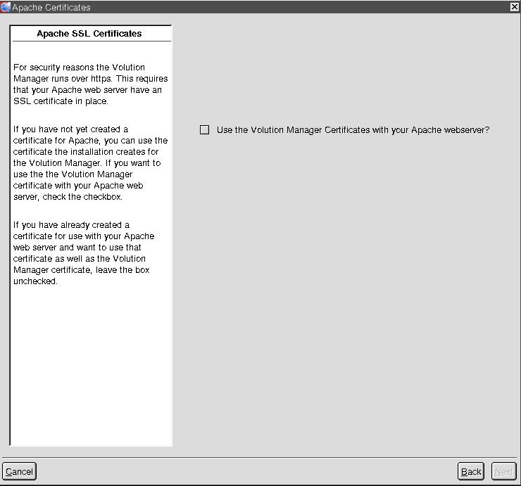 Volution Manager provides secure communication between your web browser and the Apache Web Server using an SSL certificate. If you already created a certificate for Apache, you don't need to create another one. If you want to use the certificate that the Volution Manager creates during installation, you can make that selection now.