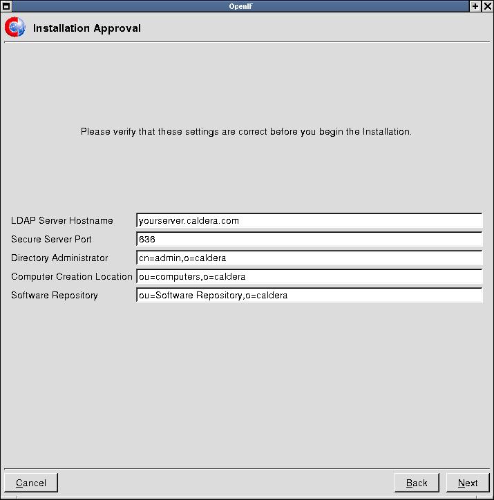Click Next. Defaults are used for all settings. See Table 2-13 for defaults. The defaults are expressed using the example server hostname, yourserver.caldera.com.