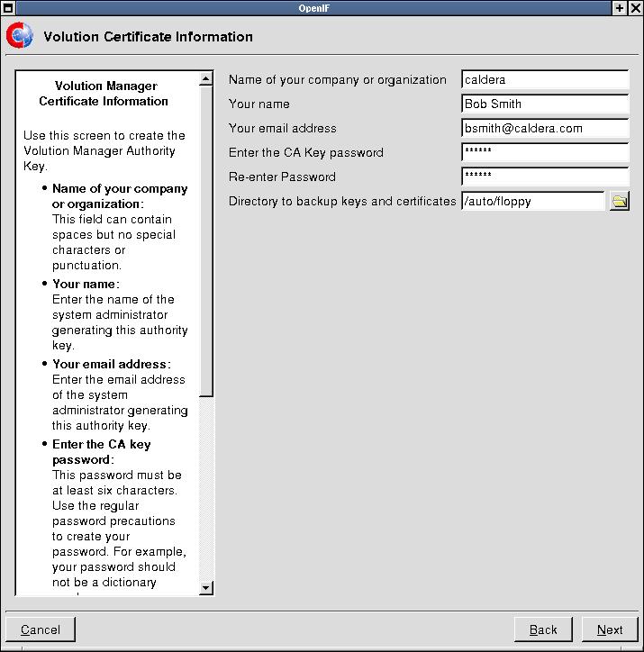 Complete the fields on the Volution Certificate Information screen, then click Next. See Table 2-11 for details.