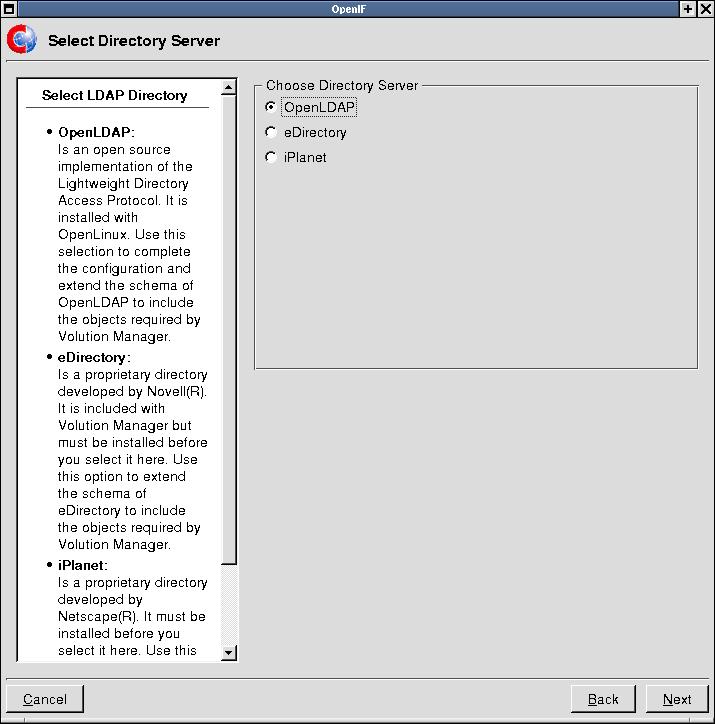 OpenLDAP | Installed with OpenLinux eServer. This selection completes the configuration and extends the schema of OpenLDAP to include the objects required by Volution Manager. |