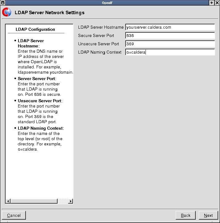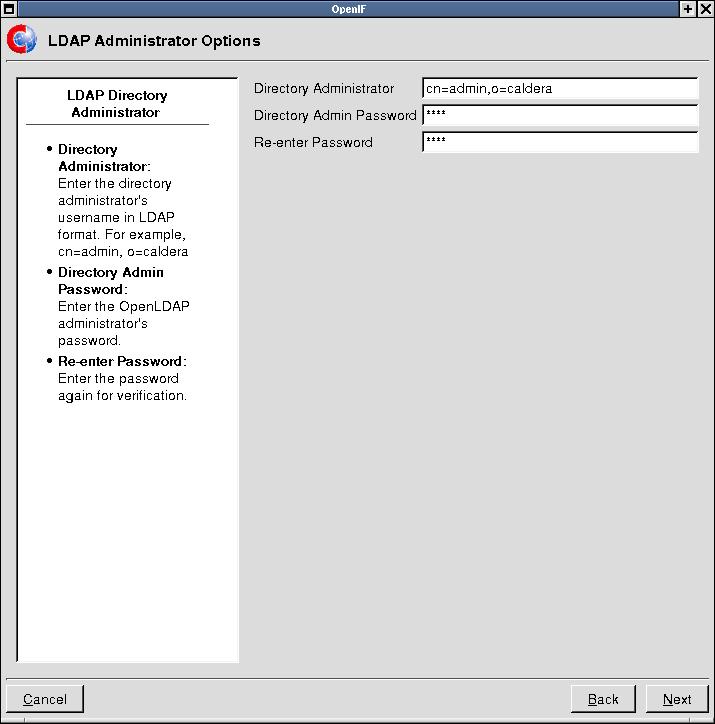 Directory Administrator | Enter the user name of the LDAP administrator. Use the LDAP entry format. For example, cn=admin,o=caldera. For information on using LDAP naming conventions, see, Table 2-1. |