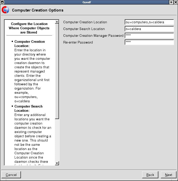 Computer Creation Location | Enter the location in your LDAP directory where the computer creation daemon creates the objects that represent managed clients. The job of the computer creation daemon is to detect and authenticate client systems as they come online. When a new client is detected, the daemon places an associated object in the directory structure. Enter the organizational unit first, followed by the organization. For example, ou=computers,o=caldera. |
