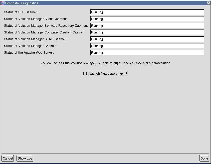 The Postinstall Diagnostic screen reports the status of the Volution Manager daemons and the VM Management Console. If a service did not start up correctly, the diagnostic screen reports it as "Failed to Start." Otherwise, the service is listed as "Running." If a daemon or the console failed to start, use the following information to troubleshoot: