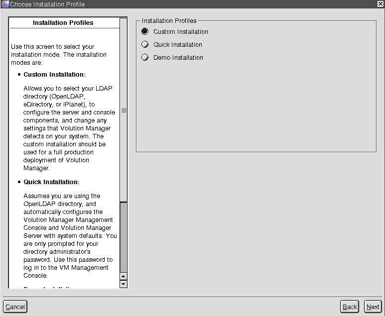 Custom Installation | Allows you to select your LDAP directory (OpenLDAP, eDirectory, or iPlanet), configure the VM Server, and change any settings that Volution Manager detects on your system. The Custom Installation option should be used for a full production deployment of Volution Manager. |