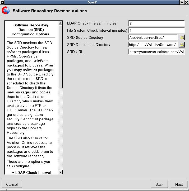 Configure the Software Repository Daemon (SRD) then click Next. See Table 2-9 for details.